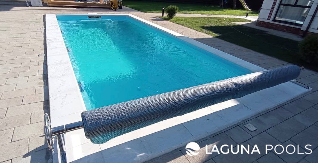 Прямоугольный композитный бассейн с защитным рулоном и светлой плиткой на улице